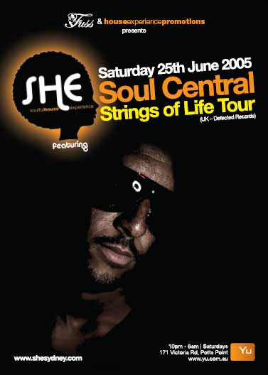 The Soulful House Experience, Sydney's hottest dance music event of 2005 is really moving up in the world, literally. SHE is moving from hot King's Cross dance music club Lepanic to the established Yu on Victoria Road, Potts Point. To celebrate the move the Soulful House Experience team have signed none other than Soul Central, the artists responsible for this years biggest house track the ARIA top 10 "Strings of Life".